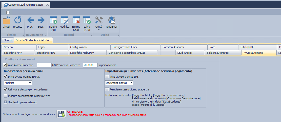 Implementazione invio avvisi automatici scadenza rate via Email o via sms; attivando lo studio con i relativi parametri (vedi istruzioni sottostanti) e attivando i condomini, partiranno in automatico gli avvisi di scadenza rata in base ai giorni da voi indicati, l’invio è stato impostato alle ore 5 del mattino.