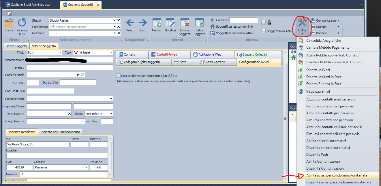 Per attivare Email/Sms sui soggetti dopo aver selezionato i soggetti per cui attivare i contatti, cliccare su Utilità - Aggiungi contatti mail per avvisi / Aggiungi contatti cellulare per avvisi