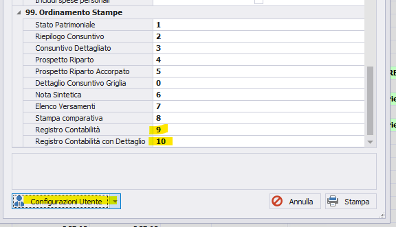 a seguito dell'aggiunta della stampa Registro Contabilità nella stampa cumulativa del Consuntivo, il programma va in errore in caso di Configurazioni personalizzate della stampa. Consigliamo di rifare la Configurazione Utente creandone una nuova. NB: nella sezione Ordinamento Stampe tutte devono riportare un numero diverso