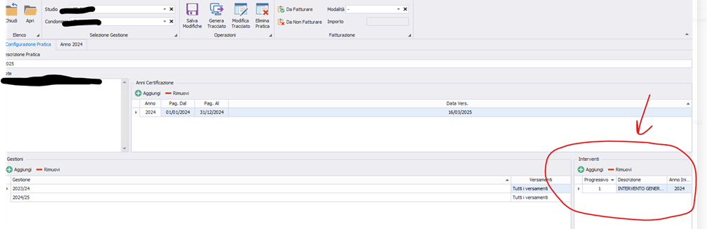 Nella configurazione della pratica, a destra c’è la sezione Interventi, il primo è già creato.